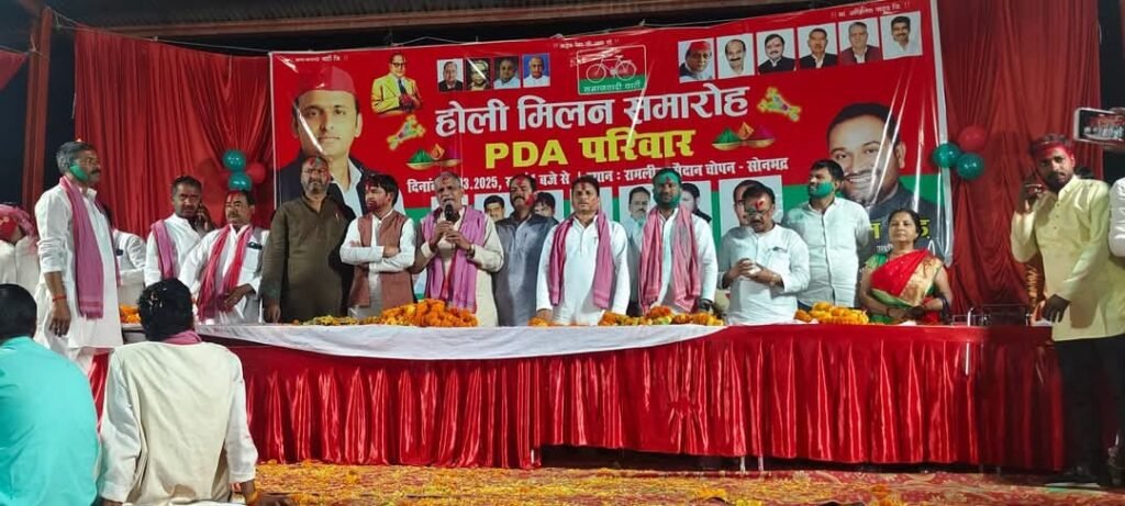 मिलन समारोह वि०स० अध्यक्ष परमेश्वर यादव की अध्यक्षता में सम्पन्न हुई। जिसका संचालन अमर नाथ यादव ने की समारोह को सम्बोधित करते हुए। मुख्य अतिथि विधान परिषद सदस्य वाराणसी आशुतोष सिन्ह ने होली की बधाई देते हुए। कहा कि यह पर्व भाई चारे एकता का रंग बिरंगी बहुत बड़ा पर्व है। कुछ स्वार्थी लोग सत्ता के लिए पी०डी०ए० समाज को बांटने का काम कर रहे है। जो देश के एकता के लिए गम्भीर खतरा पैदा कर रहे है। उनके मंसूबो धवस्त करने के लिए. समाजवादी लोगो को पी०डी०ए० के जन नायक अखिलेश यादव के नेतृत्व में एक जुट होना पड़ेगा। विशिष्ठ अतिथि स०पा० जिलाध्यक्ष राम निहोर यादव ने कहा कि सपा दलितों पिछड़ों अल्पसंख्यकों की सामाजिक के सामाजिक राजनीतिक उत्थान के लिए संघर्ष कर रही है देश के लोक तंत्र संविधान को बचाने के लिए पी०डी०ए०. समाज को समाजवादी पार्टी को मजबूत करने की आवश्यकता है। कार्य कम के संयोजक जिला पंचायत सदस्य ओबरा वि०स० के सपा० के पूर्व प्रत्याशी सुनील गौड़ एवं अल्पसंख्यक सभा के प्रदेश सचिव नजमुद्दीन इदरीसी सभी अतिथियो का स्वागत करते हुए होली की बधाई दी। कार्यक्रम में मुख्य रूप से रमेश यादव रमेश वर्मा विजय यादव सईद कुरैशी बाबूलाल यादव सत्येन्द्र ओझा रवि गौड़ सत्य देव पाण्डेय सतीश यादव रमेश सोनी महेन्द्र निषाई नरेश यादव नसरुद्दीन अभिषेक दुबै नागेन्द्र यादव अरुन मनोज यादव जाकिर हुसैन सलीम खान विनीत जाटव उपेन्द्र सेन अनवर कुरैशी नन्हें मास्टर गोपाल नन्द लाल गौड़ हिमांशु यादव जितेश गौतम अजीत कनौजिया अखिलेश यादव सत्यम पांडे इत्यादि लोग उपस्थित रहे। होली मिलन के अतिर्थियों के दिव्य भोजन की व्यवस्था प्रधान दुर्गेश यादव ने अपने आवास पर की।