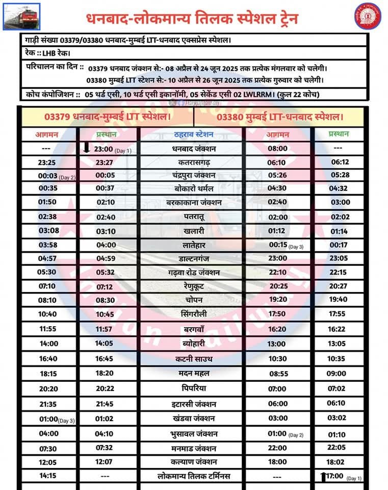 पूर्व मध्य रेलवे ने चोपन स्टेशन को दी नई ट्रेन की सौगात। 8 अप्रैल से 24 अप्रैल तक धनबाद से चलकर मुम्बई को जाएगी स्पेशल ट्रेन वाया चोपन प्रत्येक मंगलवार को जबकि मुम्बई से गुरुवार को चलेगी जो 8 अप्रैल से 26 अप्रैल तक। सूत्रों की माने तो यह लोकमान्य स्पेशल ट्रेन ट्रायल के रूप में चल रही हैं।आम जनमानस के डिमांड पर विस्तार हो सकता हैं।