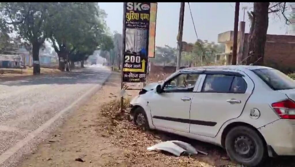 लोहे के खंभे से टकराई स्विफ्ट डिजायर सवार दंपति की कार, गंभीर रूप से हुए घायल।