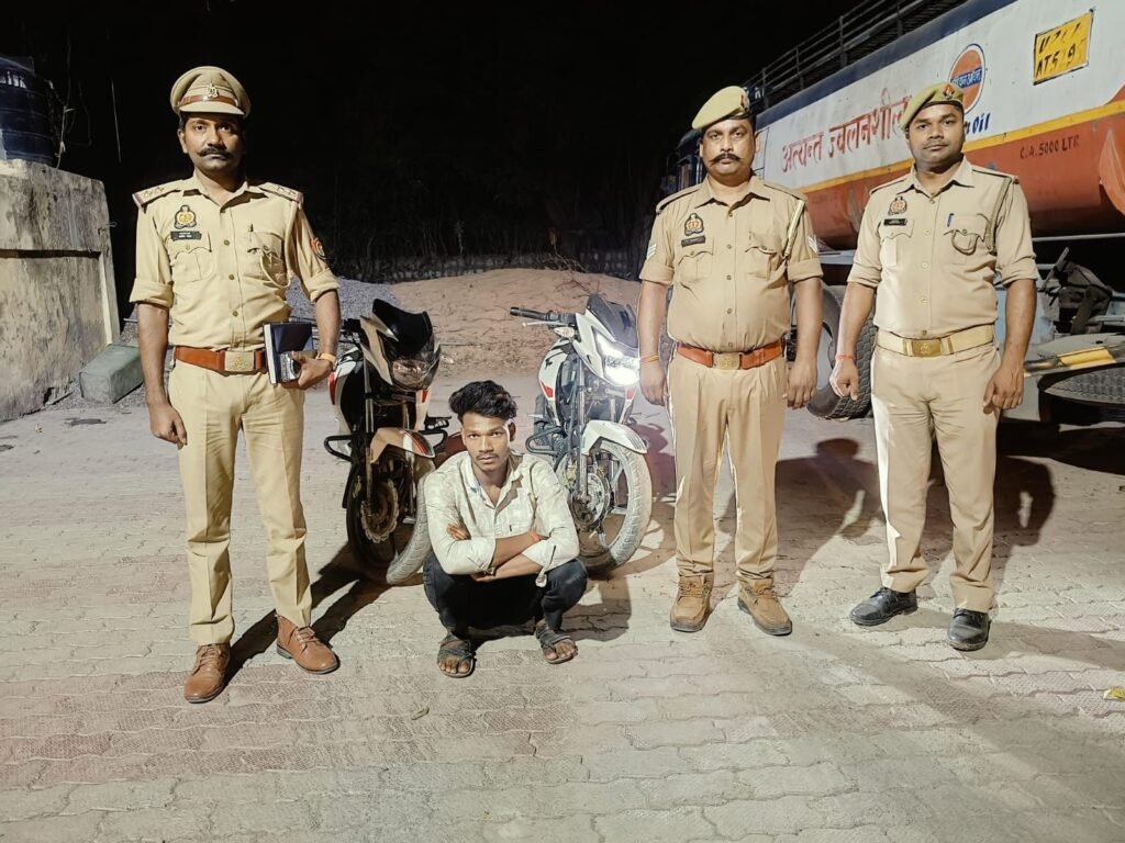 डाला सोनभद्र – वाराणसी लंका थाना क्षेत्र तथा रॉबर्ट्सगंज थाना क्षेत्र से चोरी किए हुए बिना नंबर प्लेट की अपाचे 160 सीसी की दो मोटरसाइकिलों को डाला पुलिस ने बरामद किया तथा वाहन चोर कृष्णा सिंह गोड़ पुत्र सूर्यभान सिंह गोड़ निवासी बाड़ी डाला थाना चोपन जनपद सोनभद्र उम्र करीब 22 वर्ष को मौके से गिरफ्तार किया गया तथा अन्य सहयोगी सोहेल कुरैशी पुत्र सलीम कुरैशी निवासी वार्ड नंबर 12 गौरव नगर चोपन बस स्टैंड के पास थाना चोपन सोनभद्र वांछित अभियुक्त है उक्त वाहन चोर को डाला ओबरा संपर्क मार्ग पर स्थित जिला पंचायत बैरियर बाड़ी डाला के पास से समय 17:20 बजे गिरफ्तार किया गया था। गिरफ्तारी के पश्चात सुसंगत धाराओं में अभियोग पंजीकृत करवाया गया है। इस दौरान गिरफ्तार करने वाली टीम में शामिल रहे चौकी प्रभारी आशीष कुमार पटेल हेड कांस्टेबल मनोज कुमार कांस्टेबल घनश्याम यादव