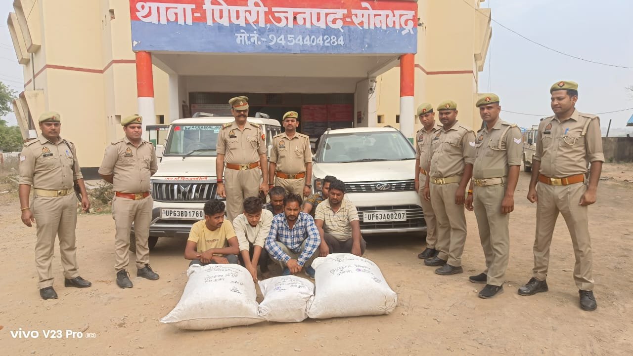 पुलिस अधीक्षक सोनभद्र के निर्देशन में अवैध मादक पदार्थों की तस्करी करने वाले तस्करों के विरुद्ध चलाए गए अभियान के क्रम में पिपरी पुलिस द्वारा मुखबिर की सूचना पर मुर्धवा रनटोला मार्ग पर स्थित तिया मोड़ के पास से छः अभियुक्तों क्रमशः शिवकुमार सिंह उर्फ शुभम पुत्र गुलाब सिंह नितेश सिंह पुत्र मुकेश सिंह, हंस लाल बिन्द पुत्र सोमारू लाल बिन्द, सुनील सिंह पुत्र रामजी सिंह, गौरव पुत्र पंचदेव, नरेश कुमार उर्फ छेदी पुत्र मेवालाल सभी निवासी चुनार जनपद मिर्जापुर को गिरफ्तार किया गया। जिनके कब्जे से 02 बोरियों में कुल 42 किग्रा गांजा व एक बोरी में, प्लास्टिक गांजा पैकिंग की पन्नी जिसका वजन 01 किग्रा गांजा व गांजा परिवहन में इस्तेमाल एक बोलेरो वाहन व एक महिन्द्रा XUV 300 वाहन के साथ ही 06 मोबाइल फोन तथा अभियुक्तगण के जामा तलाशी से 1550 रुपये, बरामदगी व गिरफ्तारी के आधार पर थाना पिपरी पर NDPS Act में अभियोग पंजीकृत कर अभियुक्तगणों को रिमाण्ड हेतु मा0 न्यायालय रवाना किया गया।बरामदगी व गिरफ्तारी करने वाली पुलिस टीम में क्षेत्राधिकारी पिपरी अमित कुमार, प्र0 नि0 नागेश कुमार सिंह, उ0नि0 नरेन्द्र कुमार राय, उ0नि0 नसीरुद्दीन अहमद, थाना पिपरी जनपद सोनभद्र शामिल रहे। ऊक्त जानकारी बुधवार की दोपहर लगभग डेढ़ बजे मिली है।