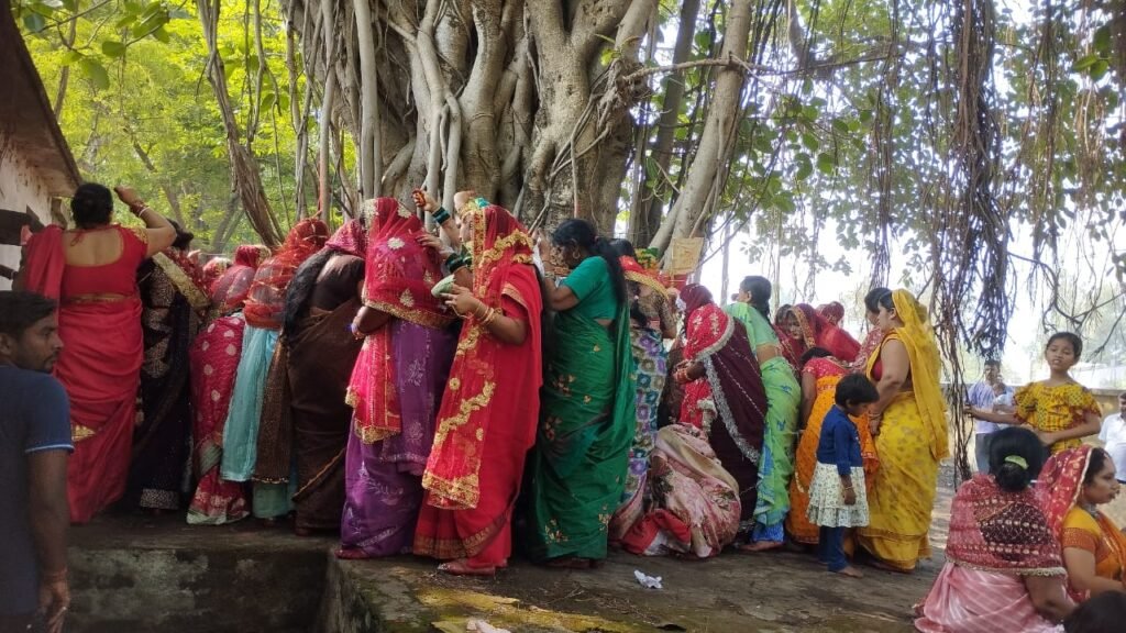 - बरगद के वृक्ष के नीचे प्रातः से ही सुहागन महिलाओं ने अनुष्ठान किया शुरू