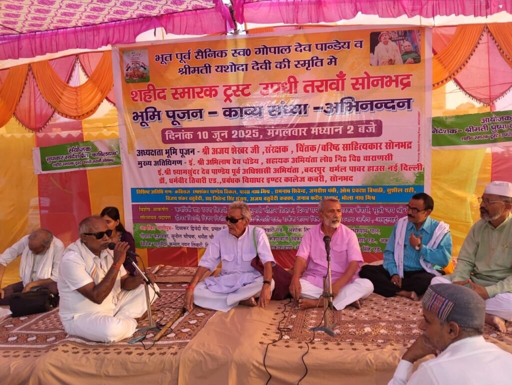 सोनभद्र। शहीद स्मारक उपधी तरावां में मंगलवार शाम भूमि पूजन, काव्य संध्या एवं अभिनंदन समारोह का आयोजन सुधाकर पांडेय स्वदेश प्रेम एवं पुष्पा देवी स्वदेश प्रेम द्वारा आयोजित किया गय। अध्यक्षता व भूमि पूजन वरिष्ठ साहित्यकार अजय शेखर ने किया और मुख्य अतिथि डॉक्टर धर्मवीर तिवारी, श्याम सुंदर देव पांडेय, अभिलाष देव पांडेय रहे । विशिष्ट अतिथि के रूप में रामनाथ शिवेन्द्र कथाकार, कांग्रेस शहर अध्यक्ष फरीद अहमद रहे। इस अवसर पर समस्त कवियों अतिथियों को लेखनी पुस्तिका अंगवस्त्र देकर अभिनंदन किया गया और जल्द ही शहीद स्मारक पर झांसी की रानी लक्ष्मीबाई, अशफाक उल्ला खां, शिवाजी की प्रतिमा लगाने का निर्णय लिया गया। राष्ट्रीय झंडा तिरंगा रोहण राष्ट्र गान पश्चात वाणी वंदना दीपदान से आयोजन का आगाज हुआ।