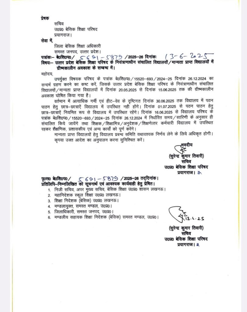अत्यधिक गर्मी एव हिट वेव के दृष्टिगत प्राथमिक उच्च /प्राथमिक /मान्यता प्राप्त स्कूलों के बच्चे 30 जून तक स्कूल नही जाएंगे। उत्तरप्रदेश सरकार द्वारा 20 मई से 15 जून तक ग्रीष्मकालीन अवकाश घोषित किया गया था। बेसिक शिक्षा अधिकारी मुकुल देव पांडेय ने अत्यधिक गर्मी एव हिट वेव को देखते हुए 30 जून 2025 तक बच्चे स्कूल नही जाएंगे।