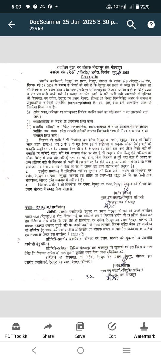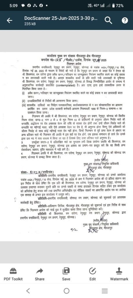 बीजपुर (सोनभद्र) जरहा वन रेंज क्षेत्र में तैनात एक चर्चित वन दरोगा को अवैध बालू खनन को शह देने के आरोप में मुख्य वन संरक्षक मिर्जापुर मंडल मनीष मित्तल ने 24 जून को निलंबित कर दिया।बताया जाता है कि जरहा वन रेंज में तैनात वन दरोगा शिवमंगल अपने तैनाती वाले क्षेत्र में नदियों से अर्से से अबैध बालू खनन के दौरान ट्रैक्टरों को रोकने और खनन माफियाओं पर कार्रवाई करने में असफल और फेल थे। बताया गया कि उक्त वन दरोगा की शह पर क्षेत्र में दर्जनों ट्रैक्टर व टीपर अवैध बालू खनन में रात दिन लगे हुए थे। ग्रामीणों की शिकायत पर गत दिनों प्रभागीय वनाधिकारी भानेन्द्र सिंह ने औचक निरीक्षण कर पिंडारी के बिच्छी नदी से अवैध बालू सहित एक ट्रैक्टर को खुद पकड़ कर कार्रवाई भी किया था।इतना ही नही इसके पहले भी बिच्छी नदी क्षेत्र सहित अजीर नदी से उड़ाका दल टीम के अलावा बभनी रेंजर और म्योरपुर रेंजर के साथ डीएफओ द्वारा गठित टास्क फोर्स टीम ने कई ट्रैक्टरों को अलग अलग समय पर पकड़ कर कार्रवाई कर चुकी है। इसके बावजूद अवैध खनन पर अंकुश लगने की बजाय जरहा क्षेत्र की नदियों से बालू खनन निरंकुश हो गया था। बालू माफिया बेखौफ दिनरात खनन में लगे हुए थे । मुख्य वन संरक्षक ने अपने आदेश में उक्त निलंबित वन दरोगा को तत्काल प्रभाव से रेनुकूट वन प्रभाग कार्यालय में अगले आदेश तक के लिए सम्बद्ध कर दिया है। अवैध खनन को लेकर वन विभाग की इस बड़ी कार्रवाई से महकमे में हड़कम्प मचा हुआ है ।