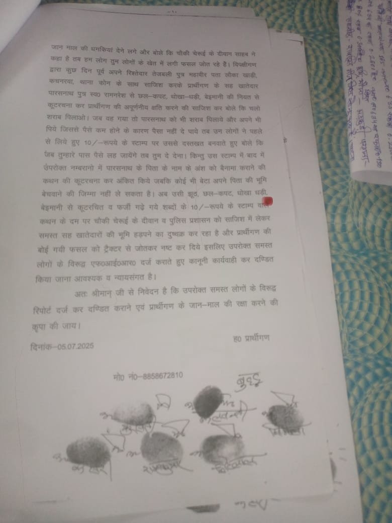 दिए प्रार्थना पत्र में आदिवासियों रामकुमार, छोटेलाल, कलवंती, बुद्धू, केशरी, सुरसती, निर्मला आदि ने अवगत कराया है कि वे अनुसूचित जनजाति गौंड़ विरादरी के हैं। 4 जून 2025 को सुबह 10 बजे दबंगों शिवमूरत, अमरनाथ, अमृतलाल व जमुनी एकराय होकर उनकी पुश्तैनी जमीन जिसमें अरहर, मक्का की फ़सल बोई गई थी को ट्रेक्टर से जुताई कर फसल को रौंद दिया। जब मना किया गया तो गंदी गंदी गालियां देते हुए जान मारने की धमकी देने लगे। जब चौकी पुलिस को शिकायती पत्र देने की बात कही गई तो कहा कि दिवान जी के कहने पर हमलोग खेत जोते हैं। इतना ही नहीं कुछ दिन पूर्व अपने रिश्तेदार तेजबली निवासी लौका खाड़ी कचनरवा, थाना कोन, जिला सोनभद्र के साथ साजिश करके सहखातेदार पारसनाथ से छल कपट, धोखाधड़ी, कूटरचना कर अपूर्णनीय क्षति करने का कार्य किया गया है। 10 रूपये के स्टाम्प पेपर पर हस्ताक्षर बनवा कर 4 विस्वा जमीन के बदले सभी आदिवासियों की 5 बीघा जमीन हड़पने की फिराक में हैं। सीओ ने मामले की जांच करवाने एवं दोषियों के विरुद्ध कार्रवाई करने का आश्वासन दिया है।