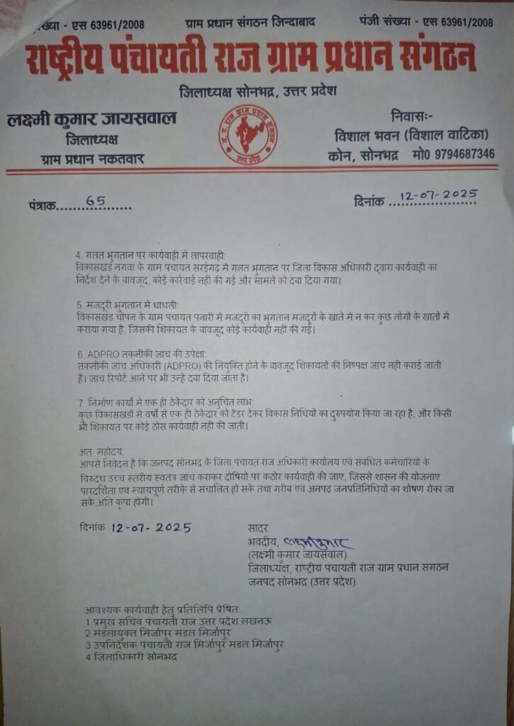 कोन / सोनभद्र – जनपद सोनभद्र उत्तर प्रदेश का एक अति पिछड़ा नक्सल प्रभावित एवं आदिवासी बहुल क्षेत्र है. जिसे शासत स्तर से एस्पिरेशनल जनपद घोषित कर विशेष प्राथमिकता दी गई है। परंतु खेद की बात है कि यहाँ पचायत विभाग में व्यापक स्तर पर भ्रष्टाचार व्याप्त है, जिसके कारण शासन की योजनाओं का लाभवास्तविक लाभार्थियों तक नहीं पहुंच पा रहा है। जिसके क्रम में ग्राम प्रधान संगठन के जिलाध्यक्ष लक्ष्मी कुमार जायसवाल ने आरोप लगाया है कि जनपद में जिला पंचायत राज अधिकारी एवं विभाग में वर्षों से जमे कुछ कर्मचारियों द्वारा योजनाओं का संचालन चहेते व्यक्तियों के इशारे पर किया जा रहा है और भ्रष्टाचार को बढ़ावा दिया जा रहा है। उदाहरण स्वरूप अंत्येष्टि स्थल निर्माण में अनियमितता शासन की मंशा के अनुसार प्रत्येक विकासखंड में ₹22 लाख की लागत से अत्येष्टि स्थलों का निर्माण किया जाना था, कितु अधिकांश कार्य जिला मुख्यालय के आसपास के गांवों में मानकों के विपरीत निजी लाभ हेतु कराए गए। फ्लाई ऐश ईट यूनिट का फर्जी संचालन जनपद में 6 पलाई ऐश ईंट यूनिट केवल कागजों पर चालू दिखाकर लाखों रुपए की बदरबांट की जा रही है।नाली व खड़जा निर्माण में घोटाला लंबी ग्राम पंचायतों में प्रस्तावित 11-12 लाख की योजना बिना जिलाधिकारी की वित्तीय स्वीकृति के कुछ सचिवो द्वारा टुकड़ों में बाँटकर कार्य कयाए जा रहे है और जनप्रतिनिधियों का शोषण किया जा रहा है।गलत भुगतान पर कार्यवाही में लापरवाही विकासखंड नगवां के ग्राम पंचायत सरईगढ़ में गलत भुगतान पर जिला विकास अधिकारी द्वारा कार्यवाही का निर्देश देने के बावजद कोई कार्रवाई नहीं की गई और मामले को दबा दिया गया।मजदूरी भुगतान में धांधली विकासखंड चोपन के ग्राम पंचायत पनारी में मजदूरी का भुगतान मजदूरों के खाते में न कर कुछ लोगों के खातों में कराया गया है, जिसकी शिननयत के बावजूद कोई कार्यवाही नहीं की गई।ADPRO तकनीकी जांच की उपेक्षा