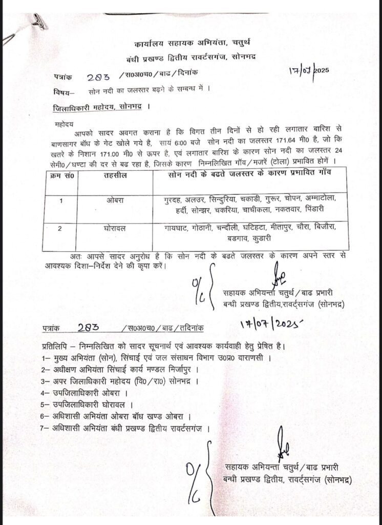 सोनभद्र लगातार तीन दिनों से हो रहे लगातार बारिश से बाढ़ सागर का जलस्तर तेजी से बढ़ने के कारण फाटक खोला गया है जिसके कारण सोन नदी का जलस्तर तेजी से बढ़ा है।सोननदी का जलस्तर 171.00 मीटर जबकि शाम 6 बजे सोननदी का जलस्तर 171.60 मीटर हो चुका है । जलस्तर बढ़ने से चौरा, बिजौरा, गुरदह, गायघाट, घटिहटा ,मीतापुर, कुराड़ी, सिंदुरिया आदि गांव के चपेट आने की सम्भावना हैं।