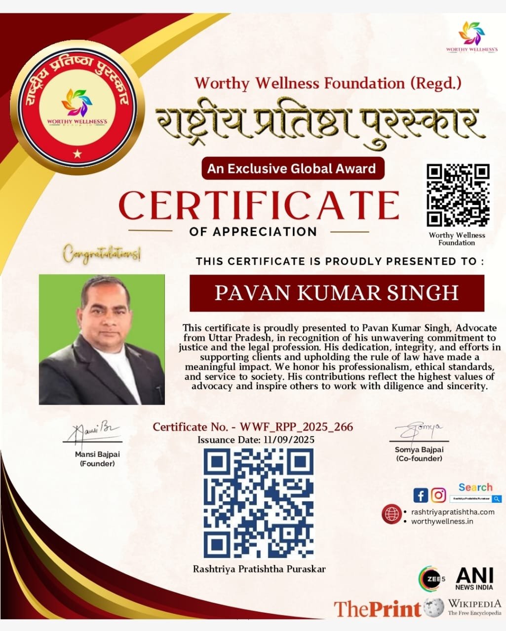सोनभद्र रॉबर्ट्सगंज शहर के वरिष्ठ अधिवक्ता व अलग पूर्वाचल राज्य की मांग कर रहे संगठन पूर्वांचल राज्य जनमोर्चा के राष्ट्रीय महासचिव अधिवक्ता पवन कुमार सिंह को पर्यावरण एवं विधि के क्षेत्र में योगदान देने के लिए लखनऊ की प्रसिद्ध सामाजिक संस्था वर्थी वैलनेस फाउंडेशन ने उन्हें राष्ट्रीय प्रतिष्ठा पुरस्कार से सम्मानित किया, फाउंडेशन की संस्थापक मानसी बाजपेई और सह संस्थापक सौम्या ने अधिवक्ता पवन कुमार सिंह को सम्मान प्रदान किया है राष्ट्रीय सम्मान मिलने पर विभिन्न संस्थाओं एवं अधिवक्ताओं ने विधि व पर्यावरण क्षेत्र में योगदान की सराहना की हैं ! इस अवसर पर राजेश कुमार यादव, राजेश कुमार मौर्य, रियाज खान, संदीप जयसवाल, प्रदीप कुमार मौर्य, नवीन कुमार पांडेय, संतोष चतुर्वेदी, अनिल कुमार प्रसाद सिंह, अविनाश यादव, फूल सिंह, शांति वर्मा, शाहनवाज आलम खान, टीटू गुप्ता, राकेश कुमार, रामगुल्ली यादव, रविन्द्र पटेल,राजकुमार पटेल, राजकुमार सिंह, मार्तंड प्रसाद पटेल, शाहिद कुरैशी, धनंजय कुमार, कृष्णनानंद सिंह, शैलेंद्र कुमार, , रौसन खां आदि लोग उपस्थित रहे !