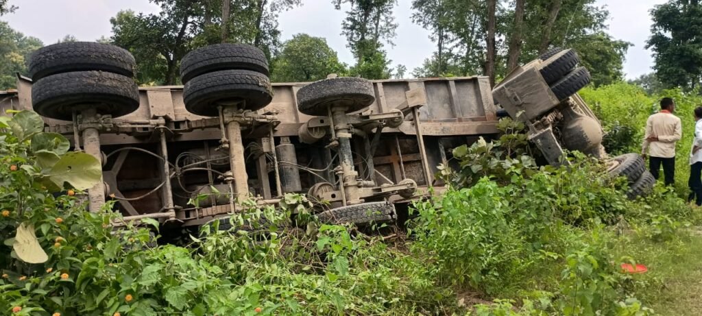 बीजपुर(सोनभद्र) स्थानीय थाना क्षेत्र के चेतवा में शनिवार को एक राखड़ लोड हाइवा चढ़ाई चढ़ते समय अनियंत्रित होकर पलट गया हादसे में चालक और खलासी बाल बाल बच गए। जानकारी के अनुसार शनिवार को एनटीपीसी रिहंद के राख बंधे से राखड़ लोड कर एक हाइवा चंदौली जा रहा था । इसी दौरान बखरिहवा बीजपुर सड़क मार्ग पूरी तरह से खराब होने के कारण चेतवा के पास पुलिया के ऊपर चढ़ाई होने की वजह से हाइवा चढ़ाई नही चढ़ पाया व बैक होकर पलट गया। हाइवा पलटते ही पुल के पास राखड़ का ढेर लग गया ।