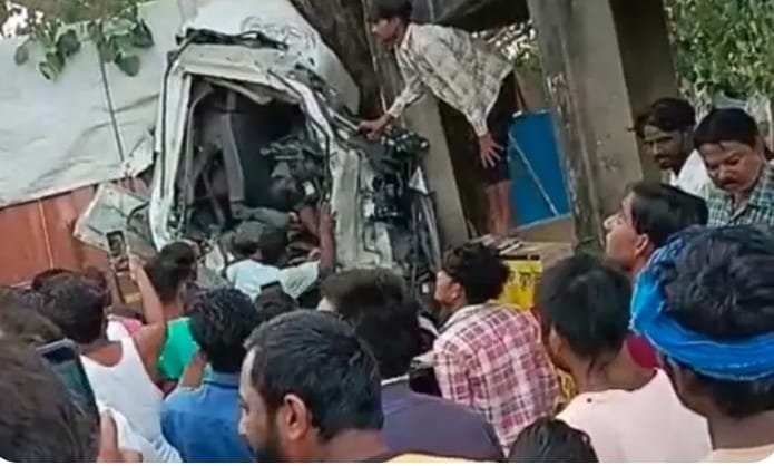 सड़क हादसे में टेलर चालक का केबिन में फसने से दर्दनाक मौत हो गई चालक को पुलिस ने जेसीबी के माध्यम से केविन से बाहर निकलवाया ।