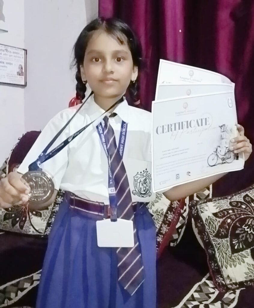 हस्तलेखन प्रतियोगिता में सफलता के लिए अवनी पाण्डेय को मिला मेडल व प्रमाण पत्र