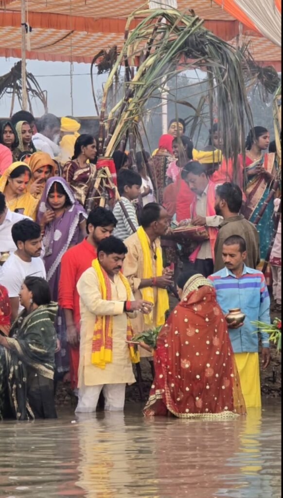श्रद्धालुओं ने सूर्योदय के पूर्व तालाब व घाटों पर पहुंचकर स्नान कर उगते सूरज की उपासना कि व एक दूसरे को छठ पर्व की बधाई दी, व्रतधारी महिलाओं ने तालाब में गीले वस्त्र से सूर्योदय होते ही पूजा अर्चना की!
