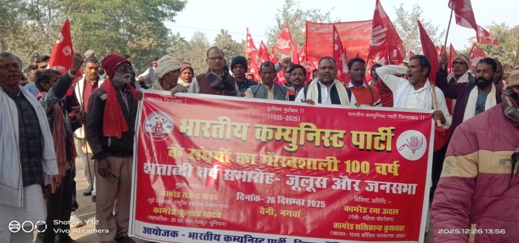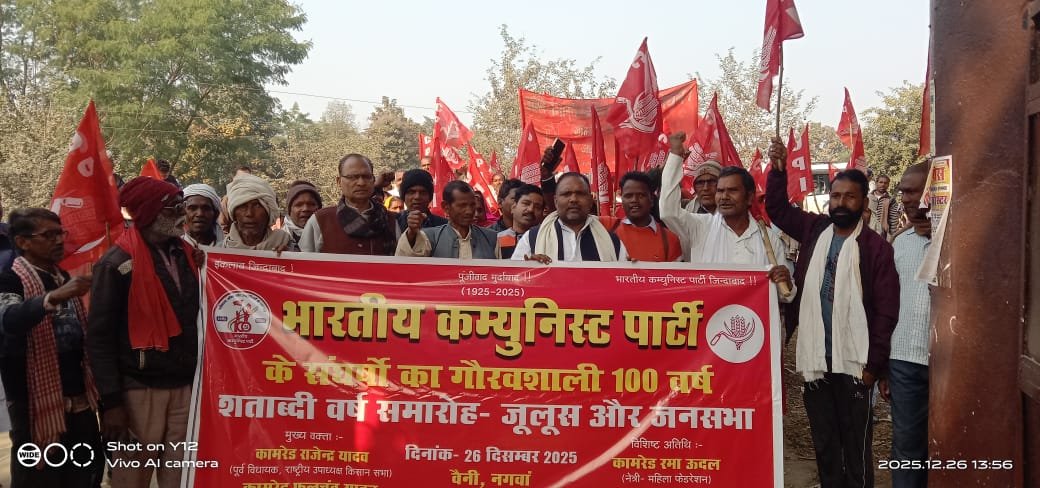 भारतीय कम्युनिस्ट पार्टी (भाकपा) का 100वाँ स्थापना दिवस सोनभद्र जनपद के नगवा विकास खंड में जोरदार तरीके से मनाया गया। इस अवसर पर वैनी दूबेपुर मोड़ से पार्टी कार्यकर्ताओं,आदिवासी, किसानों और मजदूरों ने सरकार विरोधी नारे लगाते हुए करीब 3 किलोमीटर लंबा जुलूस निकाला, जो नगवा विकासखंड कार्यालय परिसर के समक्ष पहुंचकर जनसभा में तब्दील हो गया।