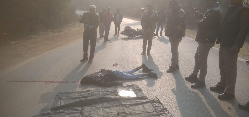 वाराणसी–शक्तिनगर राज्य मार्ग पर शव और क्षतिग्रस्त बाइक पड़ी देख राहगीरों में हड़कंप।