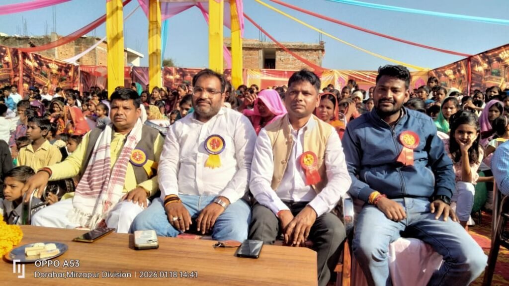 कार्यक्रम का शुभारंभ मुख्य अतिथि श्री मानसिंह गोंड जी (ब्लॉक प्रमुख, म्योरपुर) एवं विशिष्ट अतिथि वरिष्ठ समाजसेवी श्री अमरेश तिवारी (जरहाँ) द्वारा मां सरस्वती की प्रतिमा पर दीप प्रज्वलन कर किया गया।