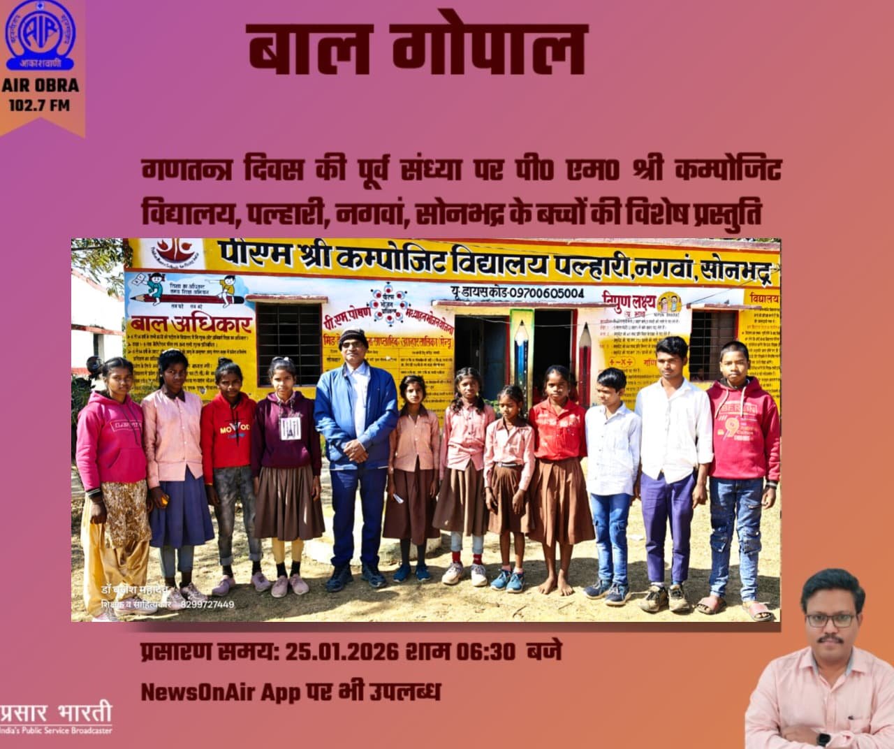 सोनभद्र। गणतंत्र दिवस की पूर्व संध्या पर पीएम श्री कंपोजिट विद्यालय, पल्हारी नगवां, सोनभद्र के बच्चों द्वारा आकाशवाणी ओबरा से एक भव्य एवं देशभक्ति से ओतप्रोत सांस्कृतिक कार्यक्रम प्रस्तुत किया गया। यह कार्यक्रम डॉ. बृजेश महादेव (ब्लाक स्काउट मास्टर) के कुशल एवं प्रेरणादायी नेतृत्व में संपन्न हुआ।