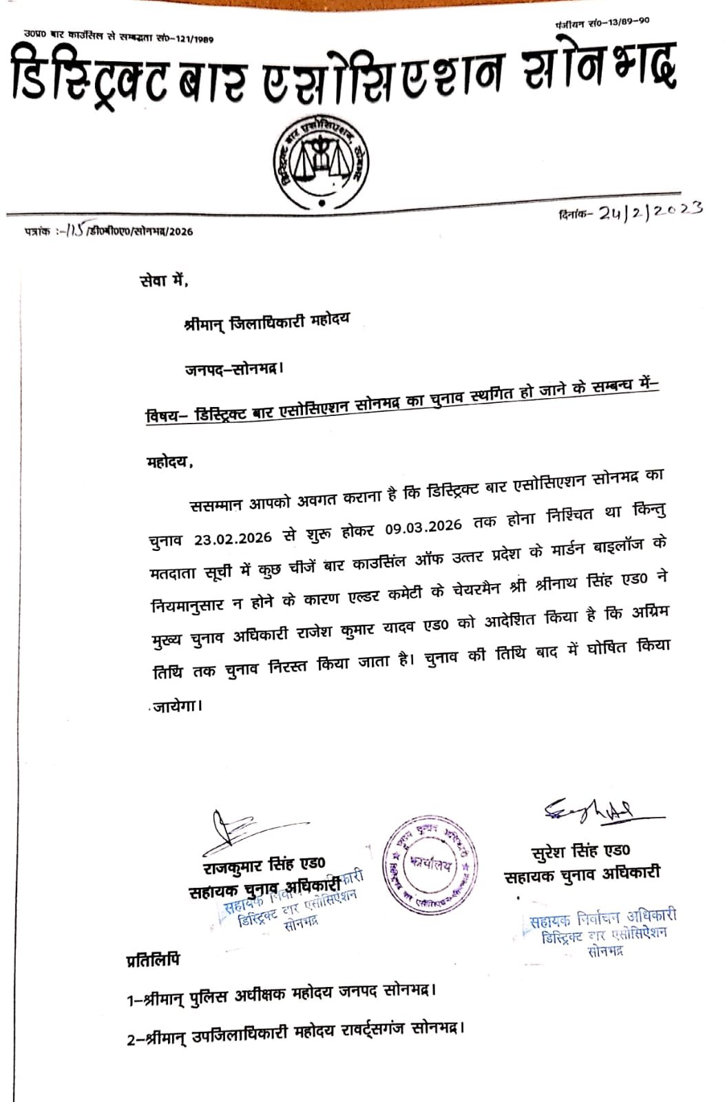 सोनभद्र। डिस्ट्रिक्ट बार एसोसिएशन सोनभद्र का वर्ष 2025-2026 का होने वाले चुनाव प्रक्रिया को एल्डर कमेटी अध्यक्ष श्री नाथ सिंह एडवोकेट ने मंगलवार को निरस्त कर दिया है। उन्होंने मुख्य चुनाव अधिकारी राजेश कुमार यादव एडवोकेट को चुनाव प्रक्रिया पर रोक लगाने के साथ ही यूपी बार काउंसिल के मार्डन बाइलॉज के अनुसार बाद में कराने का निर्देश दिया है।