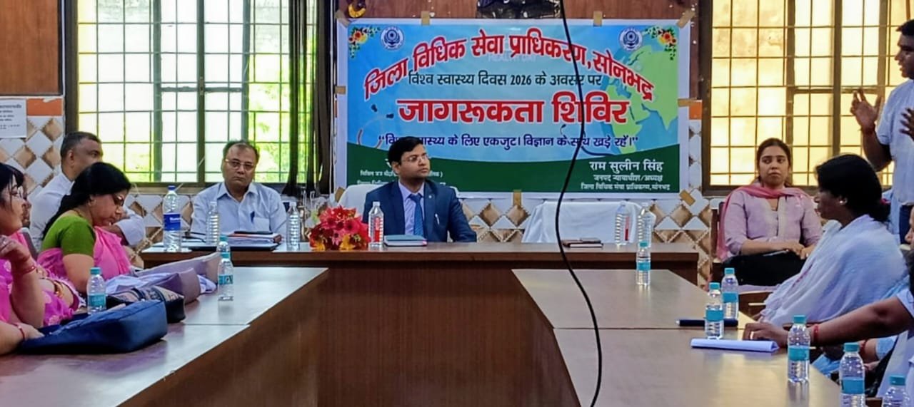 मुख्य कार्यक्रम सिविल जज सी0डी०/सचिव (पूर्ण कालिक) जिला विधिक सेवा प्राधिकरण, सोनभद्र राहुल ने मंगलवार 7 अप्रैल 2026 को सभागार मुख्य चिकित्साधिकारी सोनभद्र में विधिक जागरूकता शिविर का आयोजन किया। समारोह में सिविल जज सी.डी./ सचिव (पूर्ण कालिक) जिला विधिक सेवा प्राधिकरण, सोनभद्र, डॉ0 पी0के0 राय मुख्य चिकित्साधिकारी डॉ० प्रेमनाथ, डॉ० जी०एस० यादव अपर मुख्य चिकित्साधिकारी, डॉ० मोनिका सिंह स्त्री रोग विशेषज्ञ, डॉ0 सौरभ मनोरोग काउन्सलर एवं अन्य अधिकारीगण तथा आशा बहु, आम जन उपस्थित रहे।